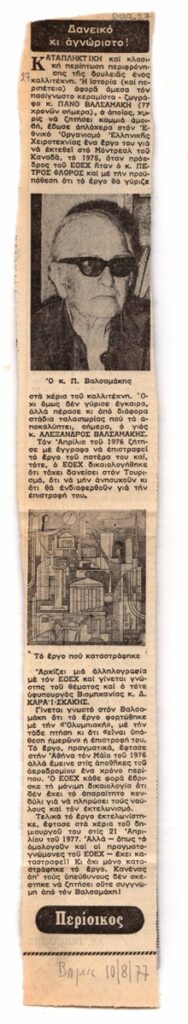 Απόκομμα, χαρτί, 34,5×5 εκ., στα ελληνικά, δημοσίευσης άρθρου για τον Πάνο Βαλσαμάκη.
