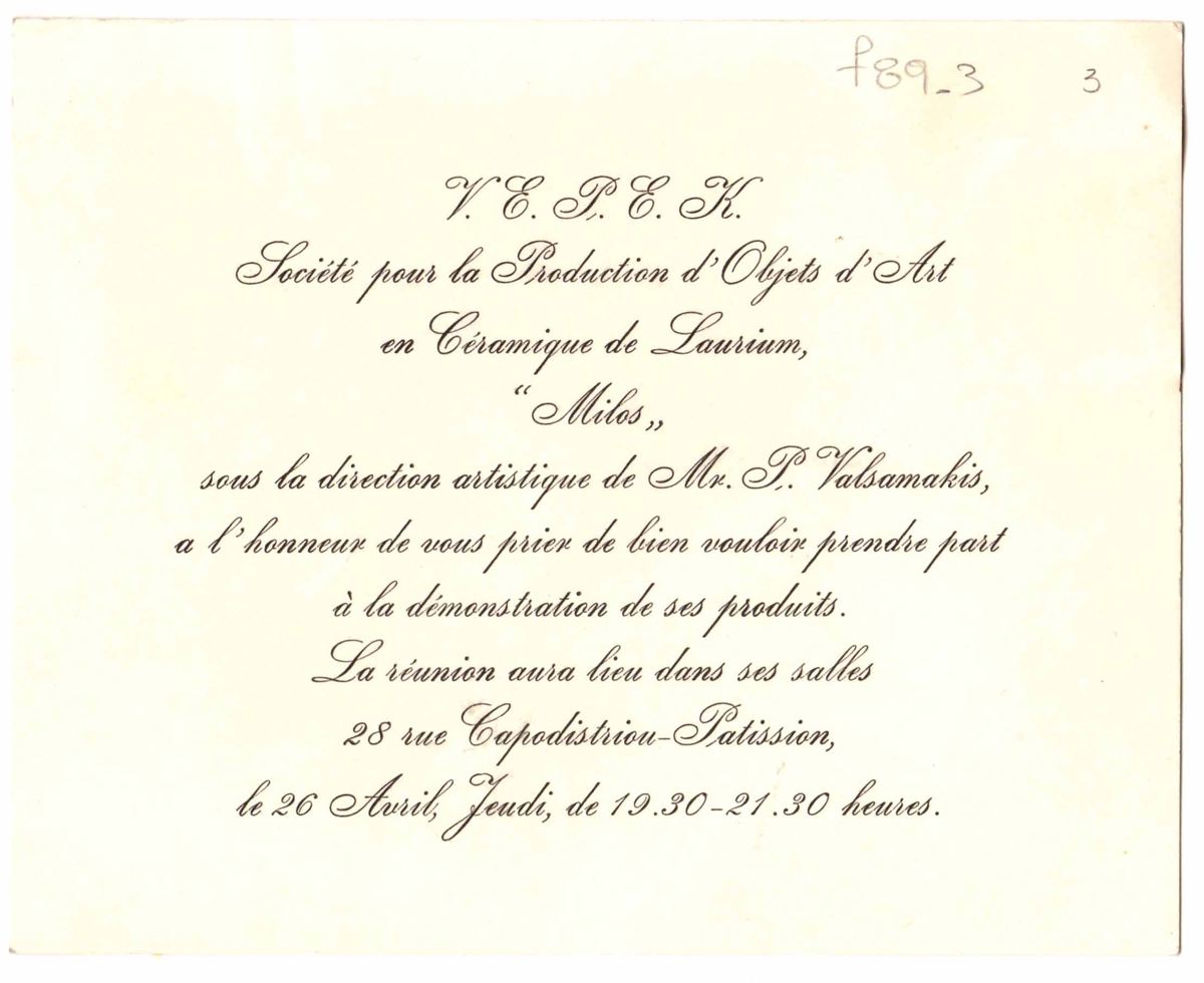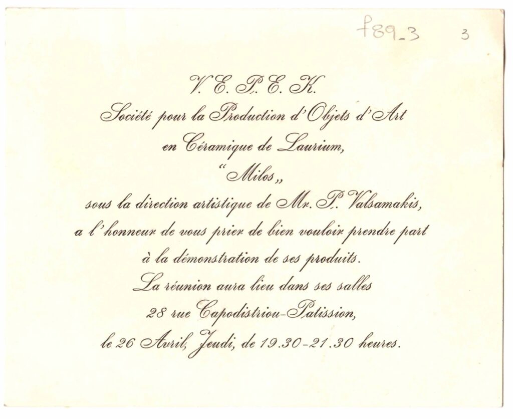 Πρόσκληση σε έκθεση, χαρτόνι, 11×13,5 εκ., στα γαλλικά, προϊόντων κεραμικής του Λαυρίου, στην Αθήνα.