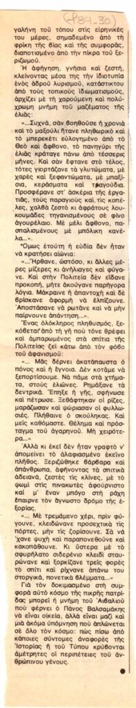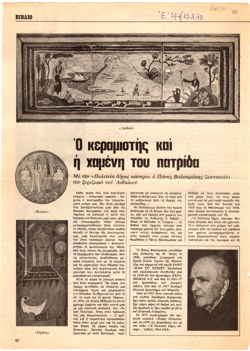 Απόκομμα του περιοδικού “Επίκαιρα” (23/08/1979) δημοσίευσης άρθρου για τον Πάνο Βαλσαμάκη και το έργο του. Περιλαμβάνεται βιογραφικό του καλλιτέχνη, επιγραφές και εικονογράφηση.