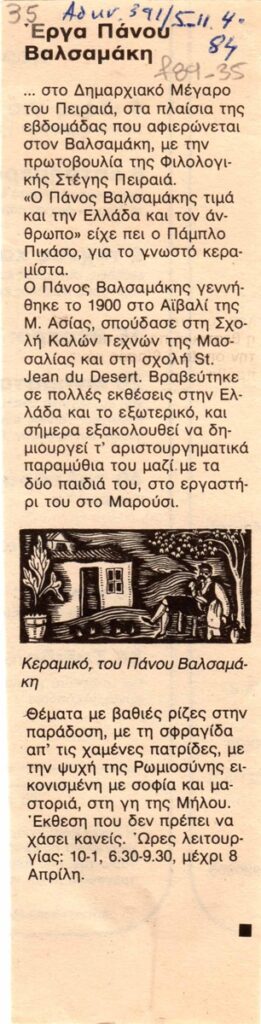 Απόκομμα, χαρτί, 18,5×5 εκ., στα ελληνικά, κειμένου για τον Πάνο Βαλσαμάκη.