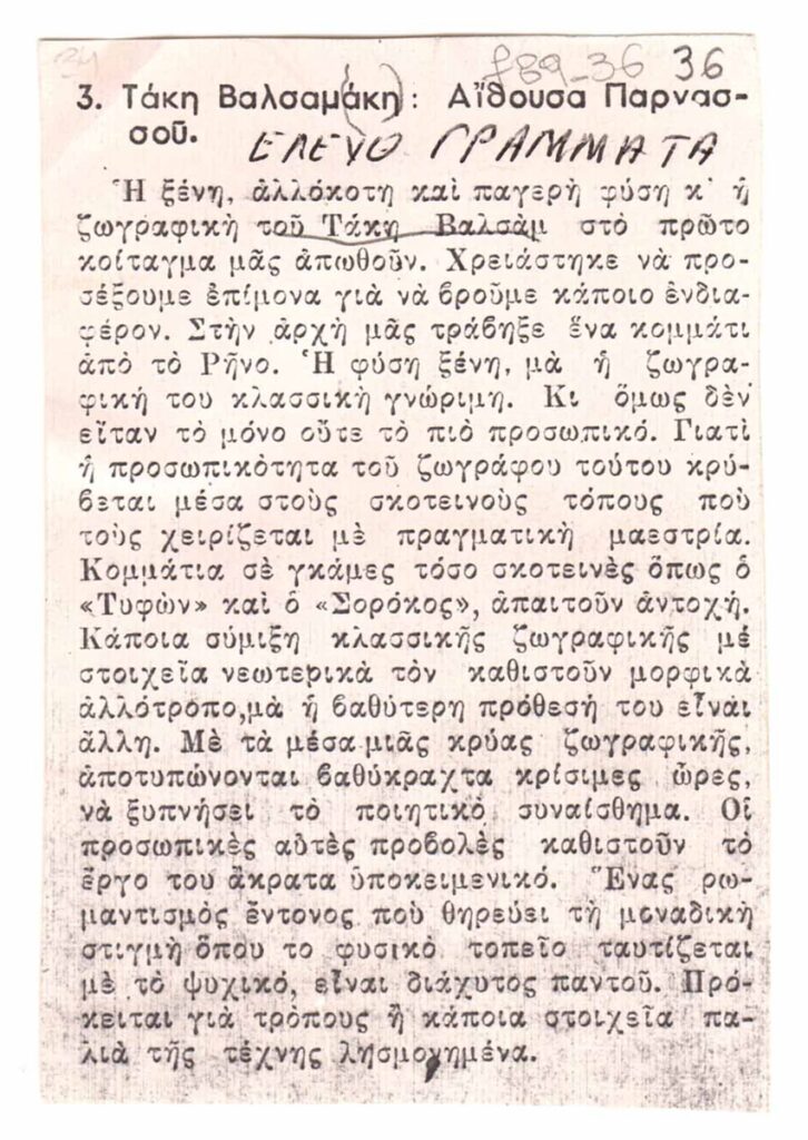 Φωτοαντίγραφο, χαρτί, 9,5×6,2 εκ., στα ελληνικά, κριτικής έκθεσης του Πάνου Βαλσαμάκη, η οποία διεξάγεται στον Φιλολογικό Σύλλογο Παρνασσό στην Αθήνα.