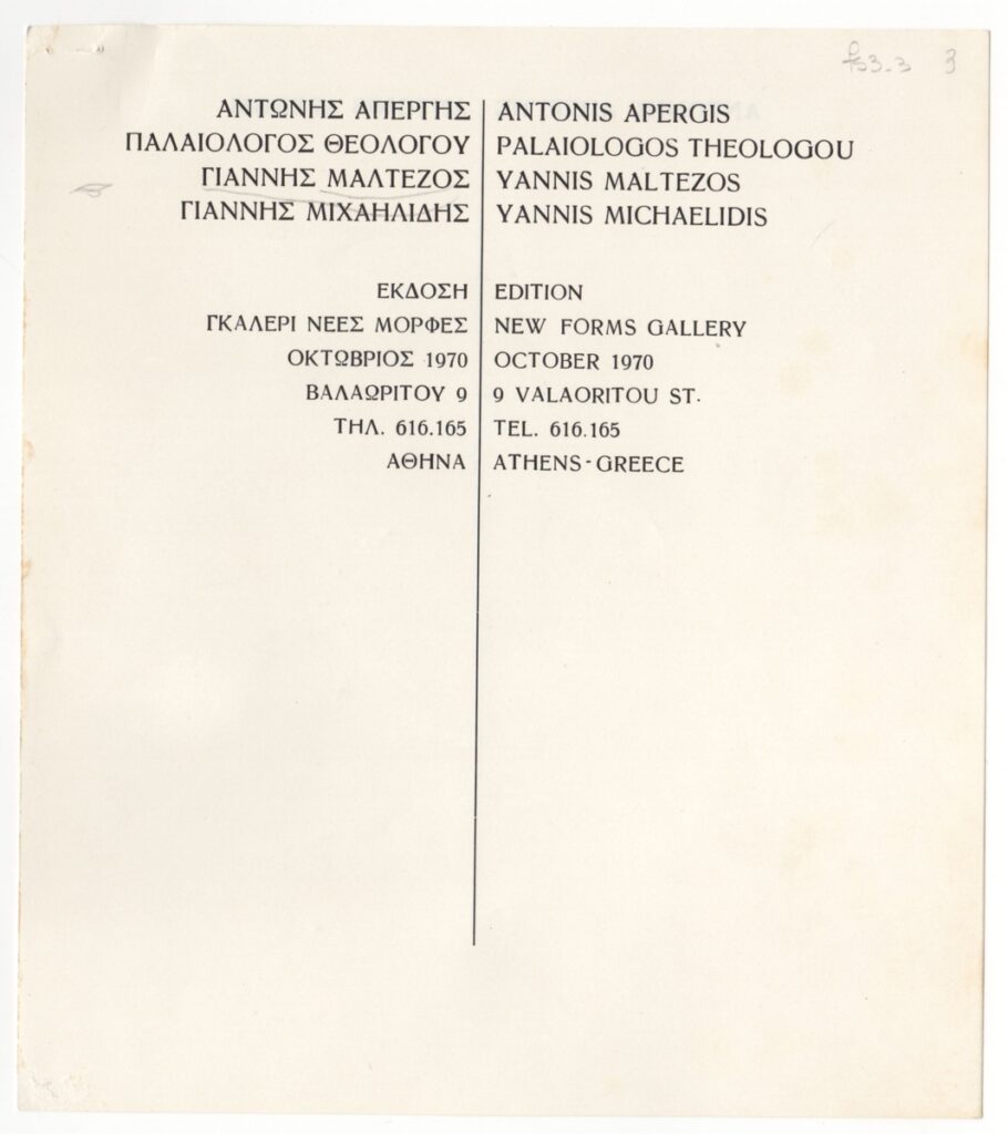 Απόκομμα, έντυπο, ιλουστρασιόν χαρτί, 5 φφ, 19,1×17,0 εκ., στα ελληνικά και τα αγγλικά. Απόσπασμα δίγλωσσου καταλόγου ομαδικής έκθεσης. Έχει συγκεντρωθεί το υλικό που αφορά στον Α. Απέργη. Περιλαμβάνει κείμενο του Π. Καραβία και εικονογραφείται με φωτογραφία του καλλιτέχνη και αναπαραγωγές 4 έργων.