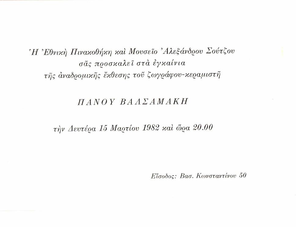Πρόσκληση αναδρομικής έκθεσης του Πάνου Βαλσαμάκη στην Εθνική Πινακοθήκη και Μουσείον Αλεξάνδρου Σούτζου στην Αθήνα.