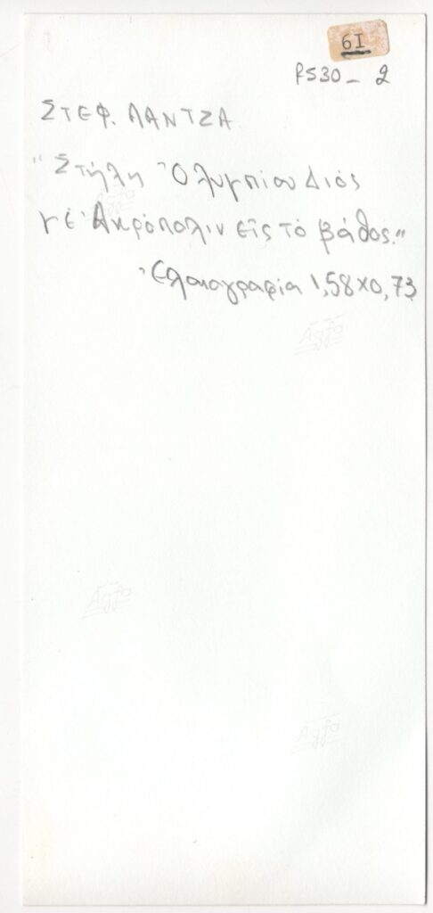 Φωτογραφία έργου, α/μ, σε φωτογραφικό χαρτί, 17,6×8,0 εκ. Στην πίσω όψη επιγραφή με τα στοιχεία του έργου και αυτοκόλλητο με αρίθμηση.