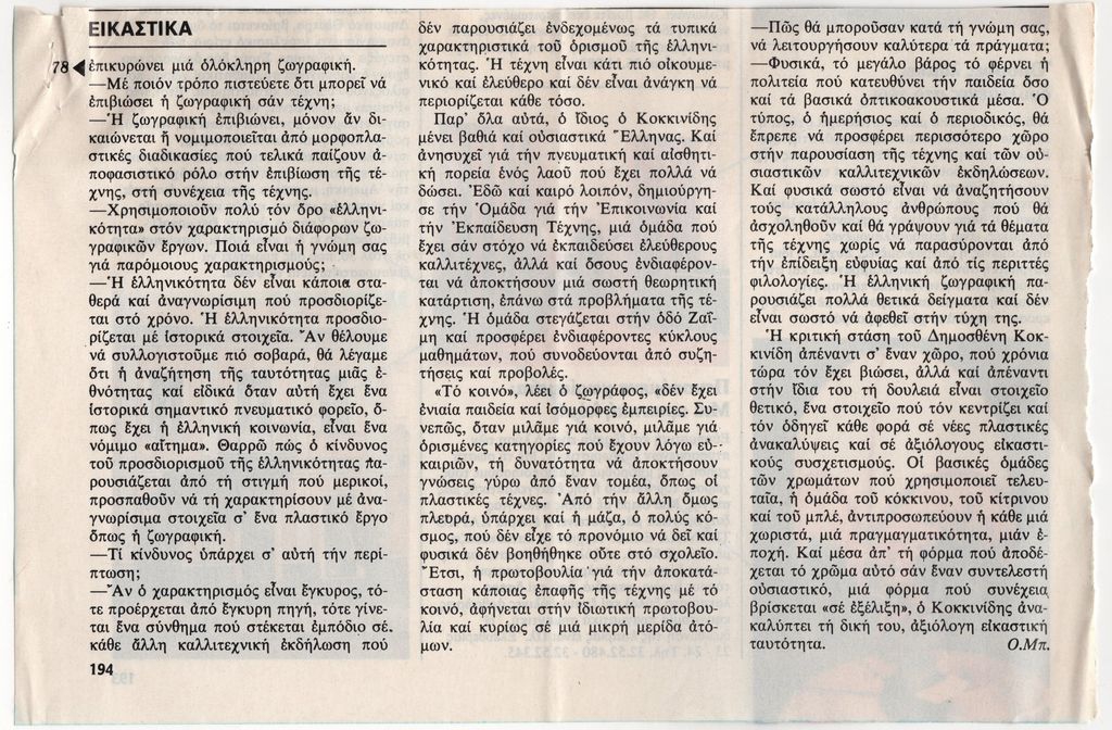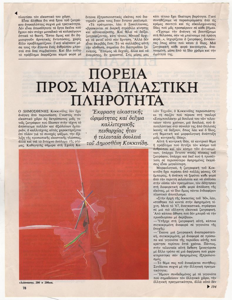 Αποκόμματα, έντυπο, χαρτί ιλουστρασιόν, 2 τμήματα, 29,8×22,5 και 15,3×22,8 εκ., όπου δημοσιεύεται, στα ελληνικά, απόσπασμα συνέντευξης του Δημοσθένη Κοκκινίδη στην Όλγα Μπατή με αφορμή την ατομική του έκθεση στην Αθήνα το 1981.