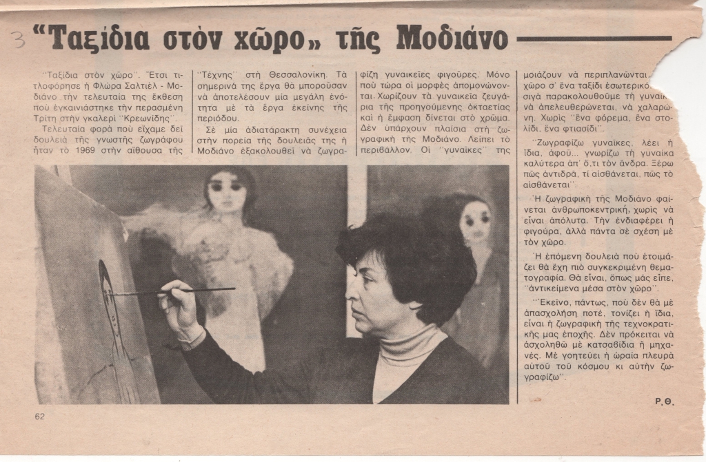 Απόκομμα, έντυπο, χαρτί, 30,0×28,8 εκ., όπου δημοσιεύεται, στα ελληνικά, κριτική της ατομικής έκθεσης έργων της Φλώρας Σαλτιέλ-Μοδιάνο με τίτλο “Ταξίδια στον χώρο”. Στην πίσω όψη, επιγραφή με τα στοιχεία της δημοσίευσης.