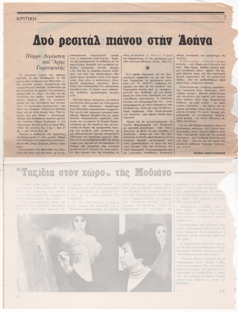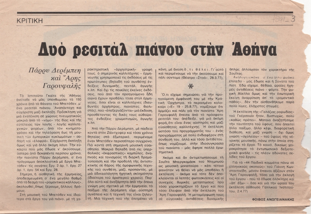 Απόκομμα, έντυπο, χαρτί, 30,0×22,7 εκ., όπου δημοσιεύεται, στα ελληνικά, κριτική του Φοίβου Ανωγειανάκη για τις συναυλίες της Πάρρυ Δερέμπεη στο Θέατρο “Στοά” και του Άρη Γαρουφαλή στην αίθουσα του Γαλλικού Ινστιτούτου τον Απρίλιο του 1977. Στην πίσω όψη, επιγραφή με τα στοιχεία της δημοσίευσης. Στο ίδιο απόκομμα, κριτική έκθεσης ζωγραφικής της Φλώρας Σαλτιέλ-Μοδιάνο.