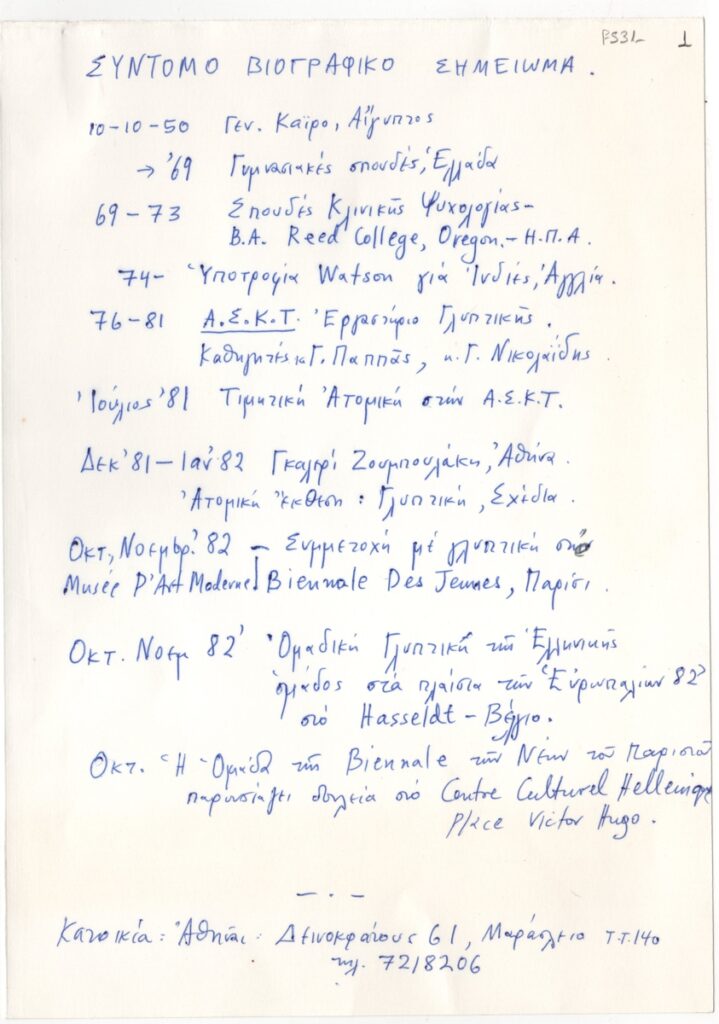 Κείμενο, χειρόγραφο, με μπλε μελάνι, σε χαρτόνι, 24,8×17,7 εκ. Σύντομο βιογραφικό σημείωμα του γλύπτη Γιώργου Λάππα οργανωμένο χρονολογικά. Δίνονται πληροφορίες για τις σπουδές, την επαγγελματική του πορεία, ατομικές και ομαδικές εκθέσεις.