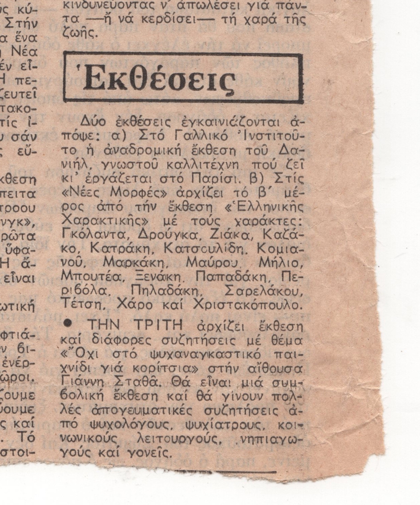 Απόκομμα, έντυπο, χαρτί, 30×11,5 εκ., όπου δημοσιεύεται, στα ελληνικά, η αναγγελία της αναδρομικής έκθεσης του Δανιήλ και του δεύτερου μέρους της ομαδικής έκθεσης “Ελληνική χαρακτική” στην Αθήνα το 1977. Στο ίδιο απόκομμα δημοσιεύεται συνέντευξη του Λουκά Σαμαρά στην Βεατρίκη Σπηλιάδη.