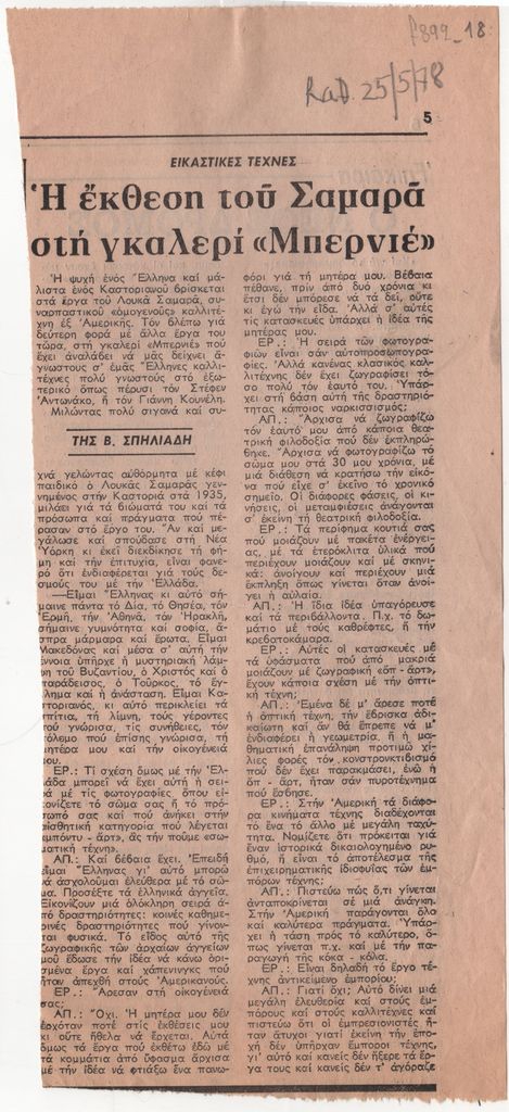 Απόκομμα, έντυπο, χαρτί, 26,5×12,0 εκ., όπου δημοσιεύεται, στα ελληνικά, συνέντευξη του Λουκά Σαμαρά στη Βεατρίκη Σπηλιάδη με αφορμή την ατομική έκθεση έργων του στην Αθήνα το 1978. Επάνω, επιγραφή με τα στοιχεία της δημοσίευσης.