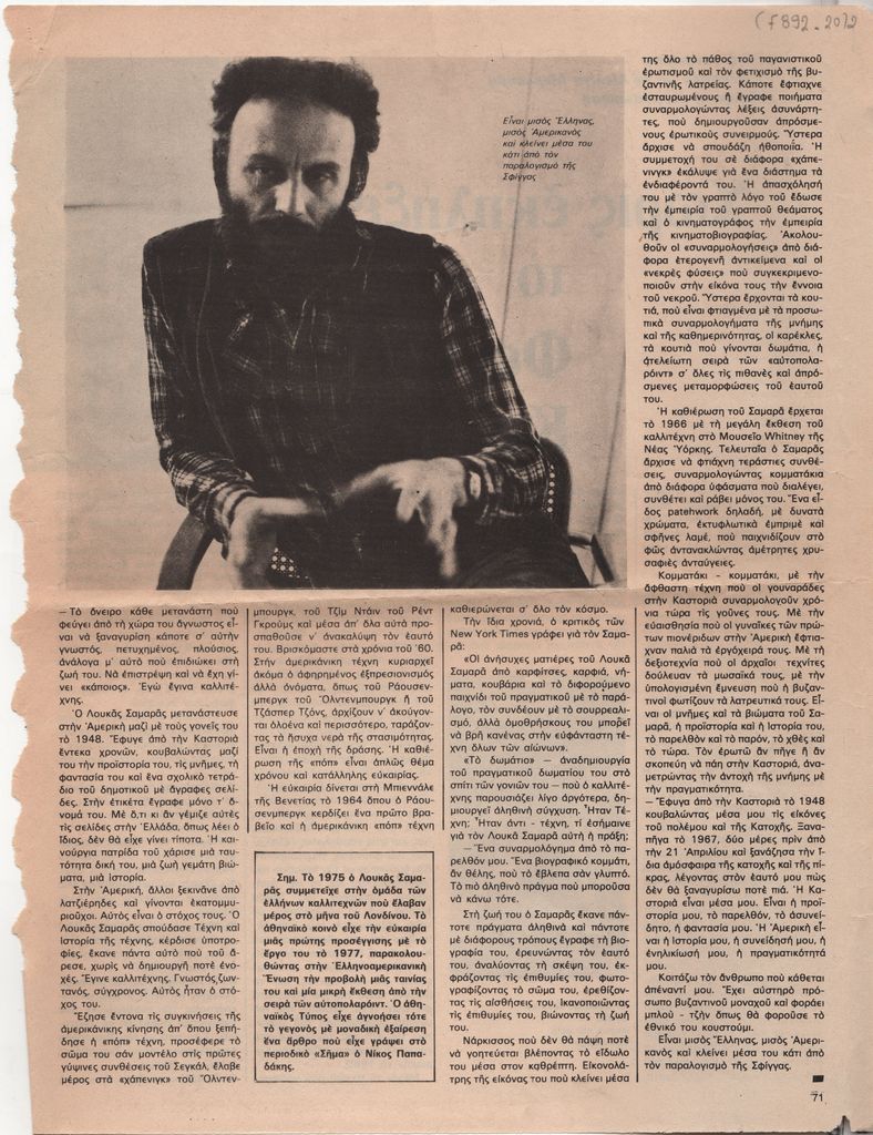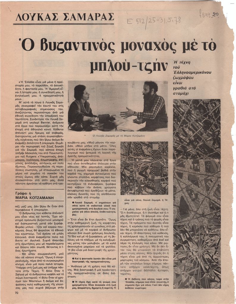Απόκομμα, έντυπο, χαρτί, 2 φφ.,31,0×22,5 εκ., όπου δημοσιεύεται, στα ελληνικά, συνέντευξη του εικαστικού Λουκά Σαμαρά στην Μαρία Κοτζαμάνη με αφορμή την ατομική έκθεση έργων του στην Αθήνα το 1978.. Επάνω, επιγραφή με τα στοιχεία του έργου.