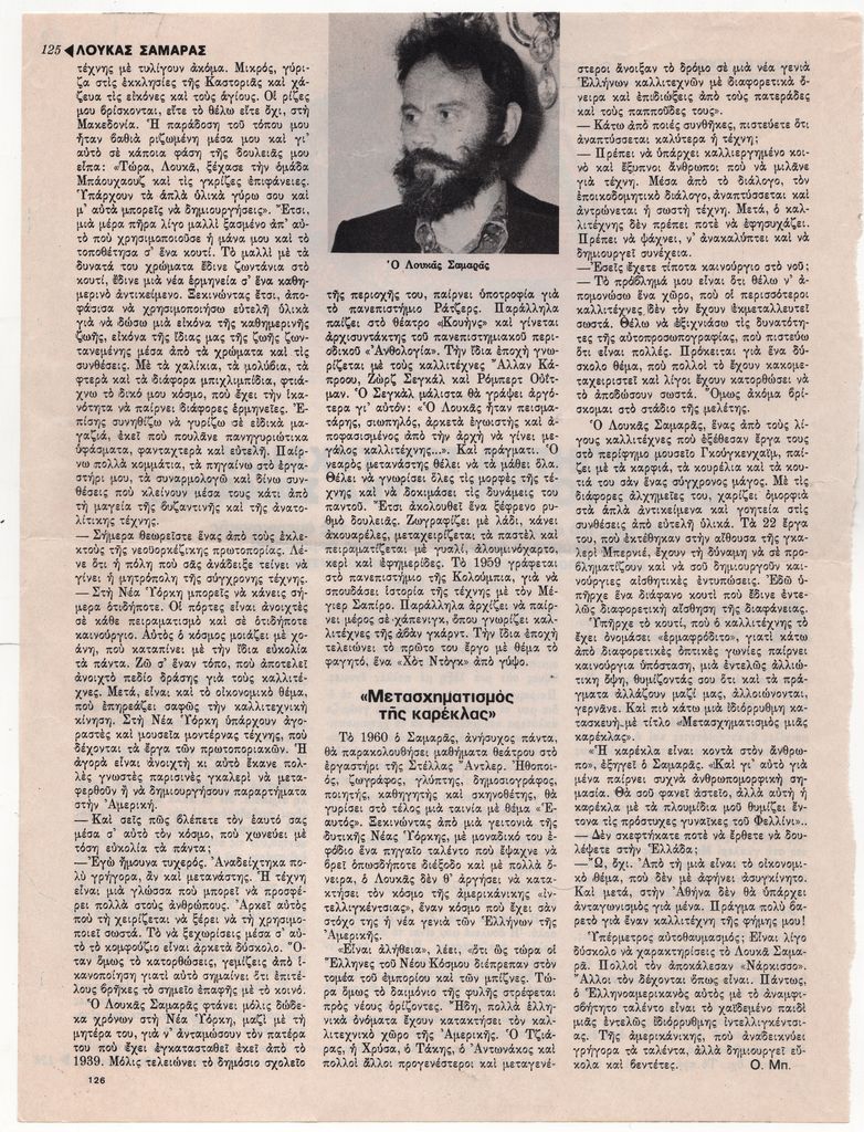 Απόκομμα, έντυπο, χαρτί, 30,0×22,5 εκ., όπου δημοσιεύεται, στα ελληνικά, συνέντευξη του εικαστικού Λουκά Σαμαρά στην Όλγα Μπατή με αφορμή την ατομική έκθεση έργων του στην Αθήνα το 1978. Επάνω, επιγραφή με τα στοιχεία της δημοσίευσης.