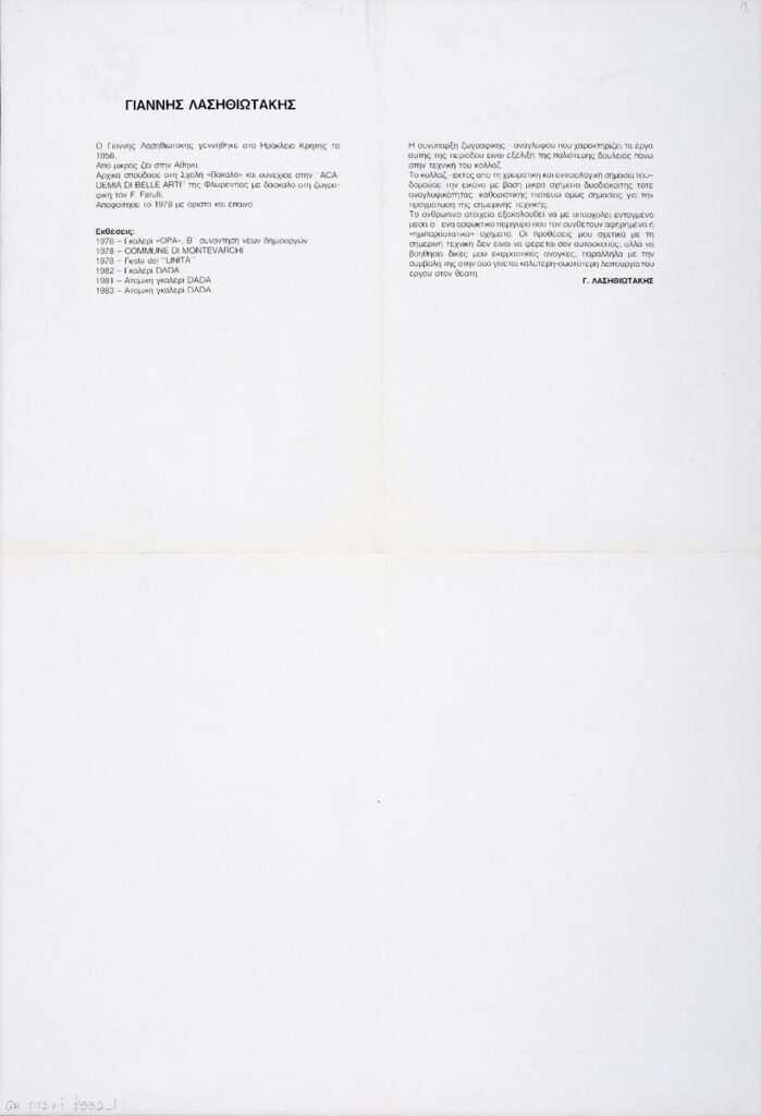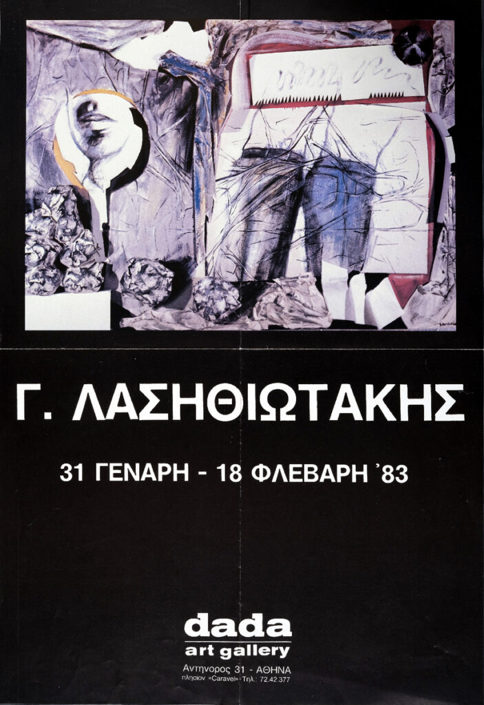 Αφίσα της ατομικής έκθεσης ζωγραφικής του Γιάννη Λασιθιωτάκη στην Dada Art Gallery στην Αθήνα. Περιέχει βιογραφικό σημείωμα.