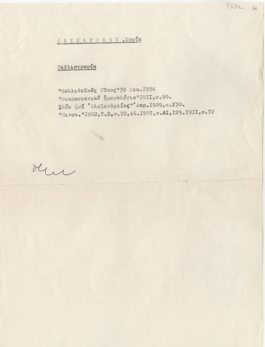 Κείμενο, δακτυλόγραφο, χαρτί, 30×21 εκ., στα ελληνικά, με βιβλιογραφία για τη Σοφία Λασκαρίδου.
