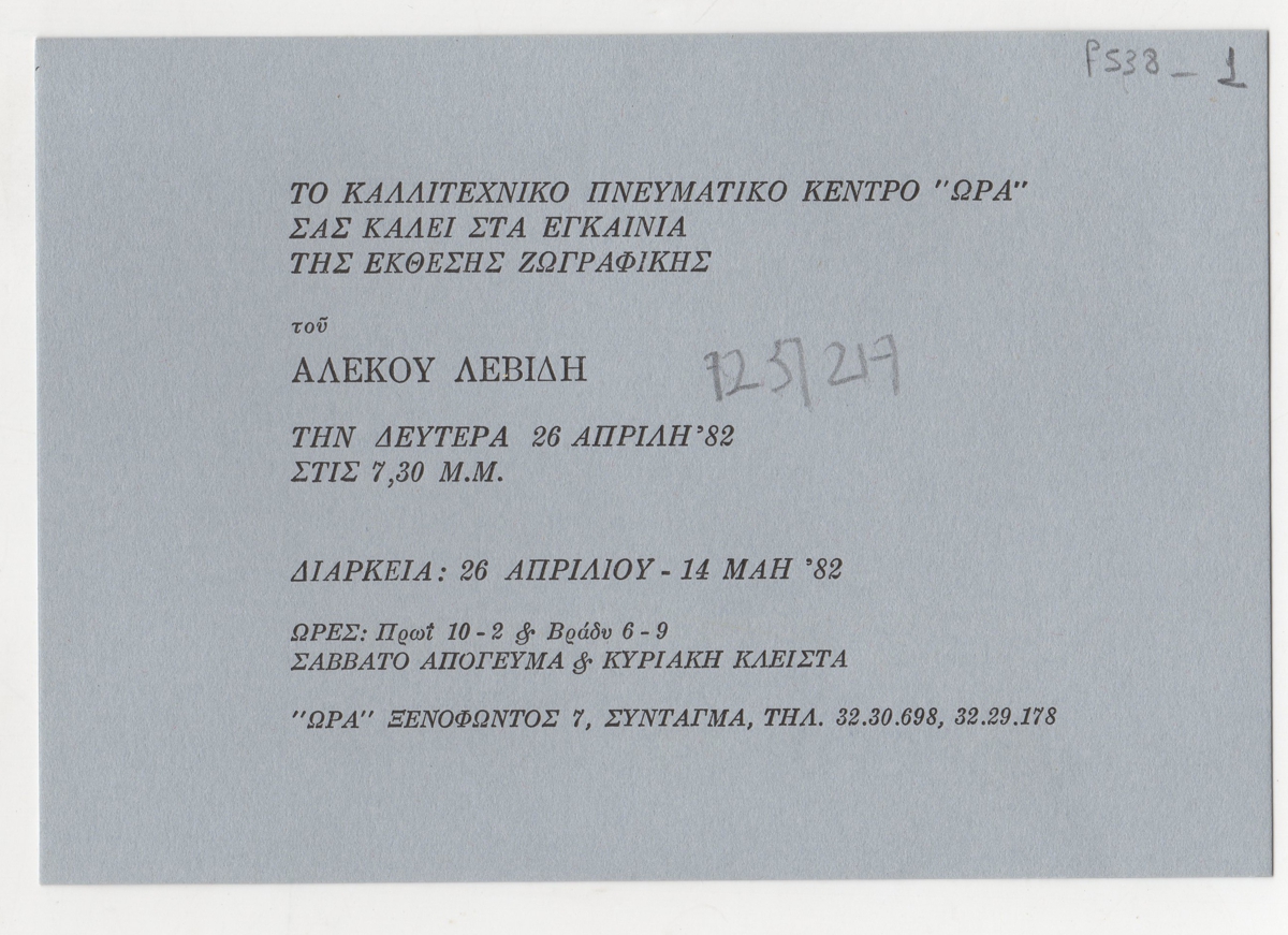 Πρόσκληση, χαρτόνι, 11×16 εκ., στα ελληνικά, εγκαινίων ατομικής έκθεσης ζωγραφικής του Αλέκου Λεβίδη.