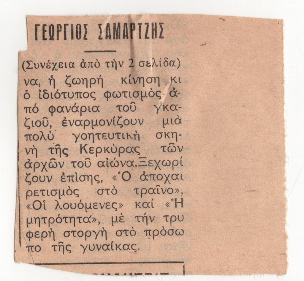 Αποκόμματα, έντυπο, χαρτί, 2 τμήματα, 43,0×9,5 και 7,5×7,5 εκ., όπου δημοσιεύεται, στα ελληνικά, το δεύτερο μέρος άρθρου του Γ. Ν. Κάρτερ για τον ζωγράφο Γεώργιο Σαμαρτζή. Επάνω, επιγραφή με τα στοιχεία της δημοσίευσης.