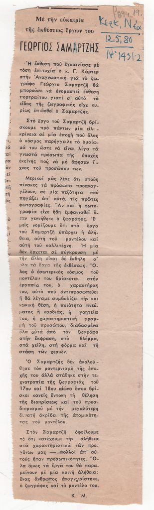 Απόκομμα, έντυπο, χαρτί, 28,2×8,0 εκ., όπου δημοσιεύεται, στα ελληνικά, άρθρο του Κ. Μ. για τον ζωγράφο Γεώργιο Σαμαρζή με αφορμή την αναμνηστική έκθεση έργων του στην Κέρκυρα το 1980. Δεξιά, επιγραφή με τα στοιχεία της δημοσίευσης.
