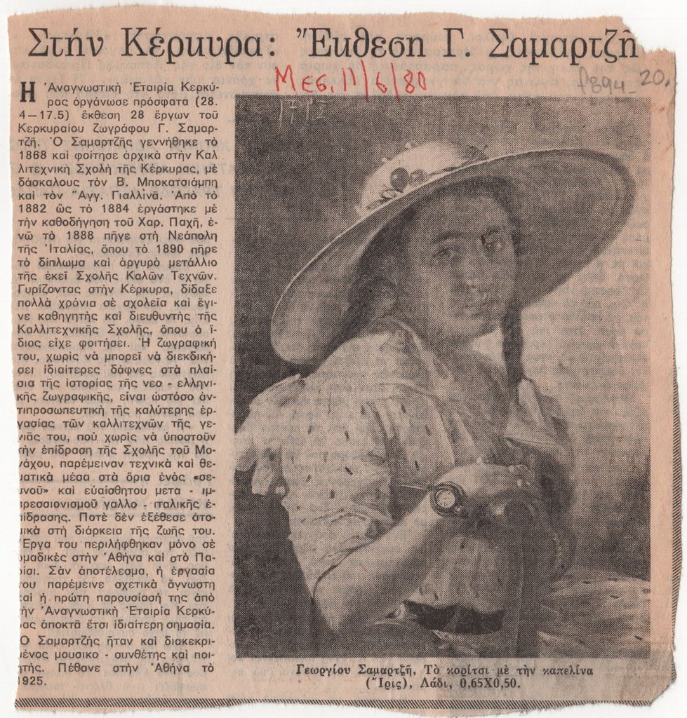 Απόκομμα, έντυπο, χαρτί, 16,0×15,0 εκ., όπου δημοσιεύεται, στα ελληνικά, άρθρο για τον ζωγράφο Γεώργιο Σαμαρτζή με αφορμή την αναμνηστική έκθεση έργων του στην Κέρκυρα το 1980. Επάνω, επιγραφή με τα στοχεία δημοσίευσης.