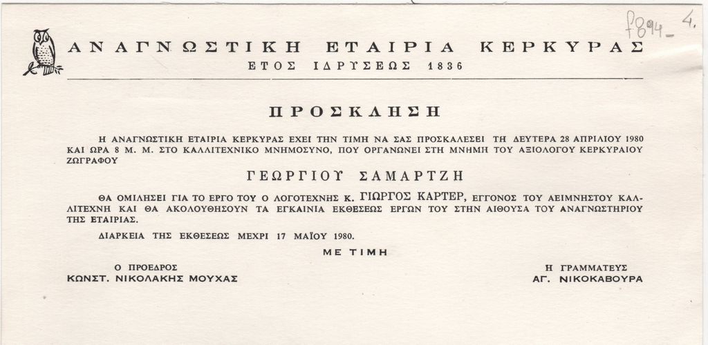 Έντυπο, στα ελληνικά, μονόφυλλο, χαρτόνι, 10,8×19,8 εκ. Πρόσκληση εγκαινίων της αναμνηστικής έκθεσης ζωγραφικής του Γεωργίου Σαμαρτζή στην Κέρκυρα το 1980. Στα πλαίσια της εκδήλωσης πραγματοποιήθηκε ομιλία του εγγονού του καλλιτέχνη, λογοτέχνη Γιώργου Κάρτερ.