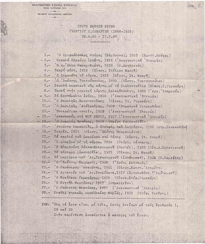 Φωτοαντίγραφο κειμένου, στα ελληνικά, δακτυλόγραφο, χαρτί της Αναγνωστικής Εταιρίας Κέρκυρας, 30,3×25,0 εκ. Κατάλογος έργων της αναμνηστικής έκθεσης ζωγραφικής του Γεωργίου Σαμαρτζή στην Κέρκυρα το 1980.