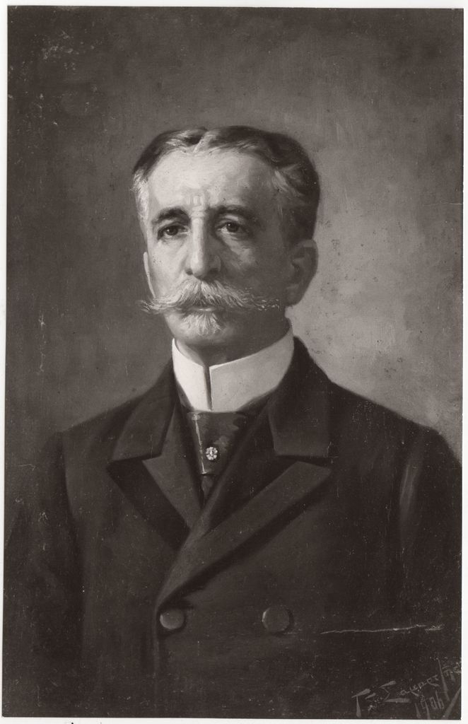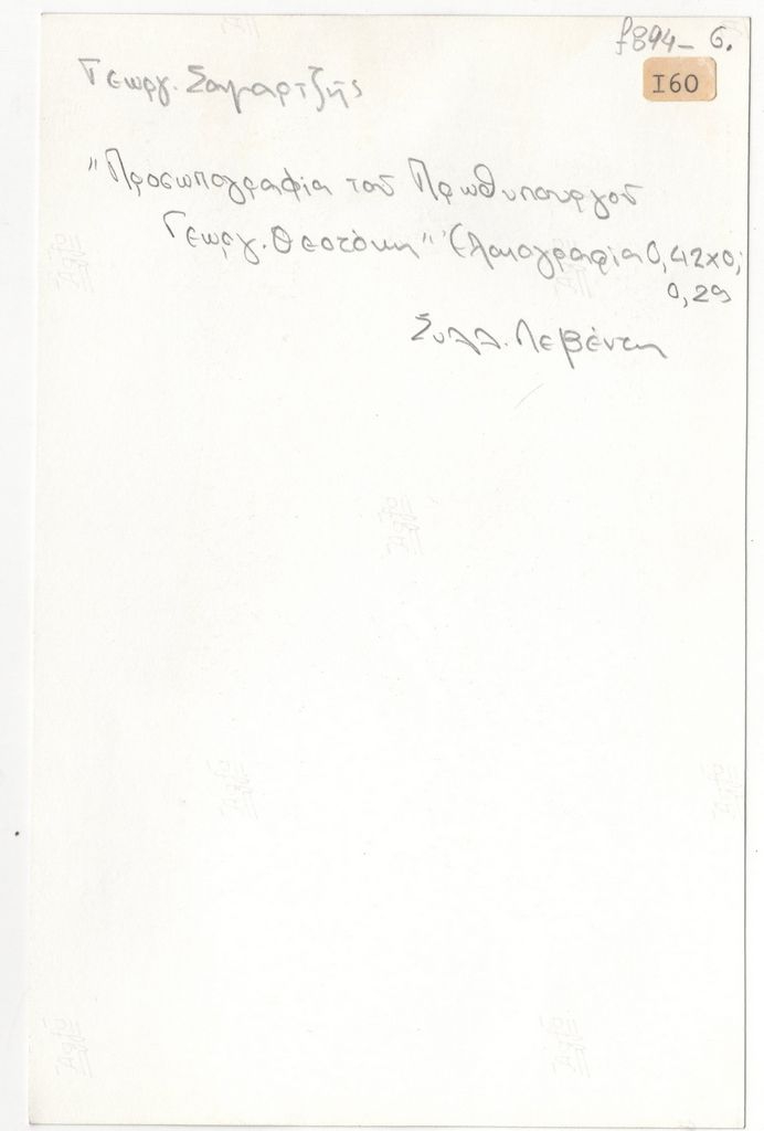 Φωτογραφία,α/μ, φωτογραφικό χαρτί, 17,8×11,5 εκ. Αναπαραγωγή του έργου του Γιώργου Σαμαρτζή “Προσωπογραφία του πρωθυπουργού Γεωργ. Θεοτόκη” (ελαιογραφία, 1906). Στην πίσω όψη, επιγραφή με τα στοιχεία του έργου.