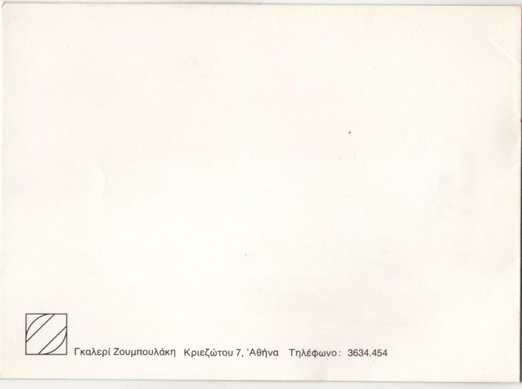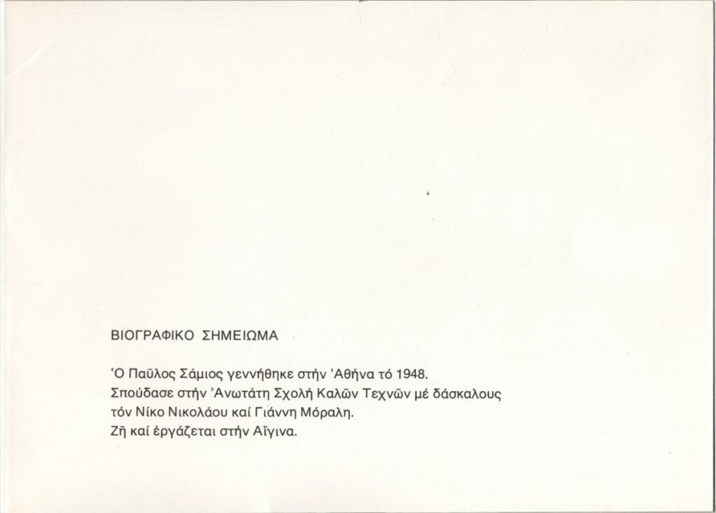 Έντυπο της ατομικής έκθεσης έργων του Παύλου Σάμιου στην Γκαλερί Ζουμπουλάκη στην Αθήνα.