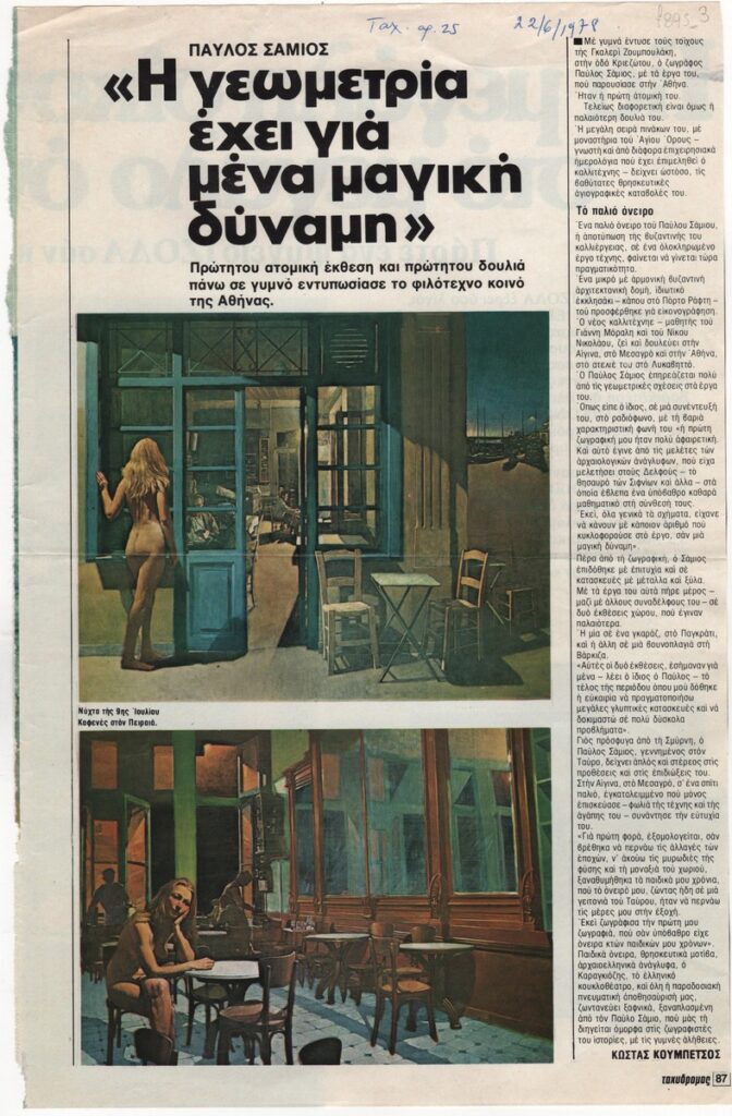Απόκομμα του περιοδικού “Ο Ταχυδρόμος” (22/06/1978), όπου δημοσιεύεται συνέντευξη του ζωγράφου Παύλου Σάμιου με αφορμή την έκθεση έργων του στην Αθήνα.