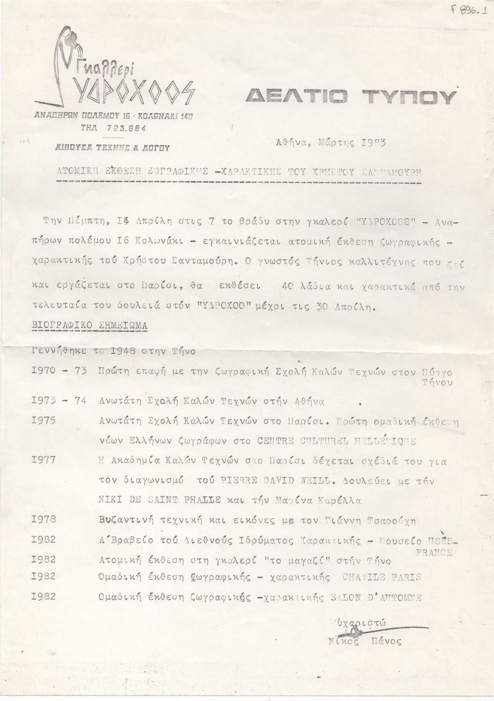 Κείμενο, στα ελληνικά, δακτυλόγραφο, χαρτί, 29,8×21,0 εκ. Δελτίο τύπου της ατομικής έκθεσης ζωγραφικής και χαρακτικής του Χρήστου Σανταμούρη στην Αθήνα το 1983. Περιέχει σύντομο βιογραφικό του καλλιτέχνη.