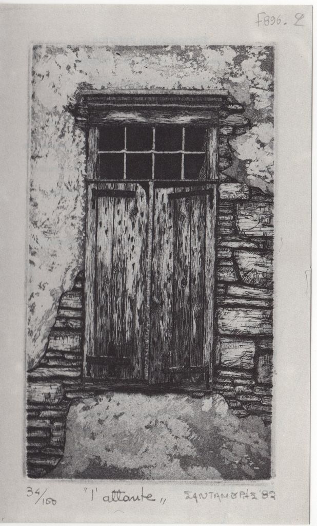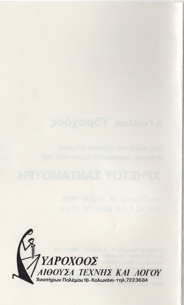Έντυπο, στα ελληνικά και γαλλικά, δίπτυχο, χαρτί ιλουστρασιόν, 17,3×11,5 εκ. , Πρόσκληση των εγκαινίων της ατομικής έκθεσης ζωγραφικής και γλυπτικής του Χρήστου Σανταμούρη στην Αθήνα το 1983. Περιέχει σύντομο βιογραφικό καλλιτέχνη. Στο εξώφυλλο, εικονογράφηση.