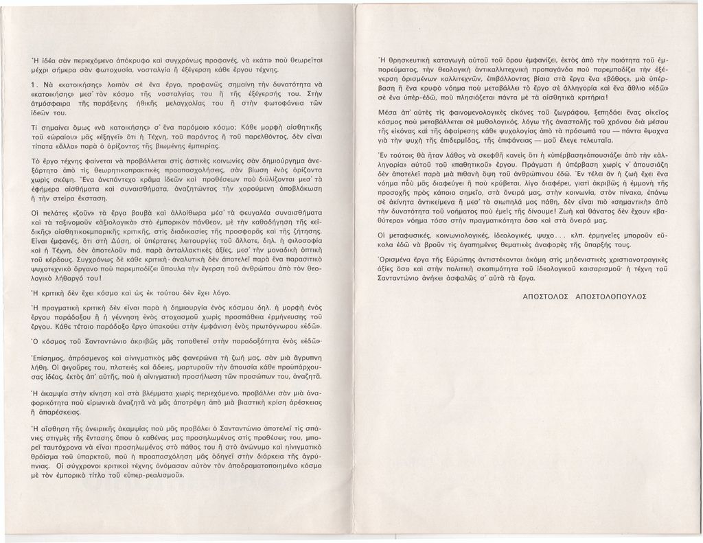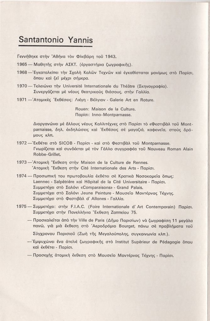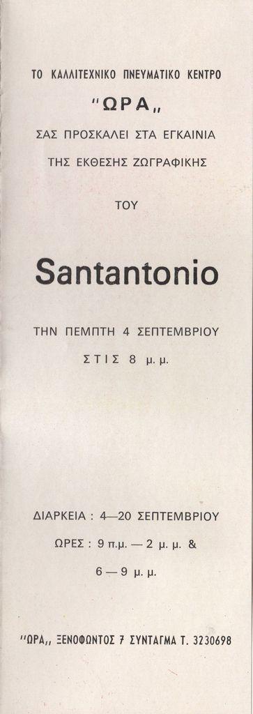 Έντυπο, στα ελληνικά, τετράπτυχο, χαρτί ιλουστρασιόν, 21,5×14,0 εκ. Πρόσκληση των εγκαινίων της ατομικής έκθεσης του Γιάννη Σανταντόνιο στην Αθήνα το 1975. Περιέχει κείμενο του Απόστολου Αποστολόπουλου και σύντομο βιογραφικό καλλιτέχνη. Στο εξώφυλλο, εικονογράφηση.
