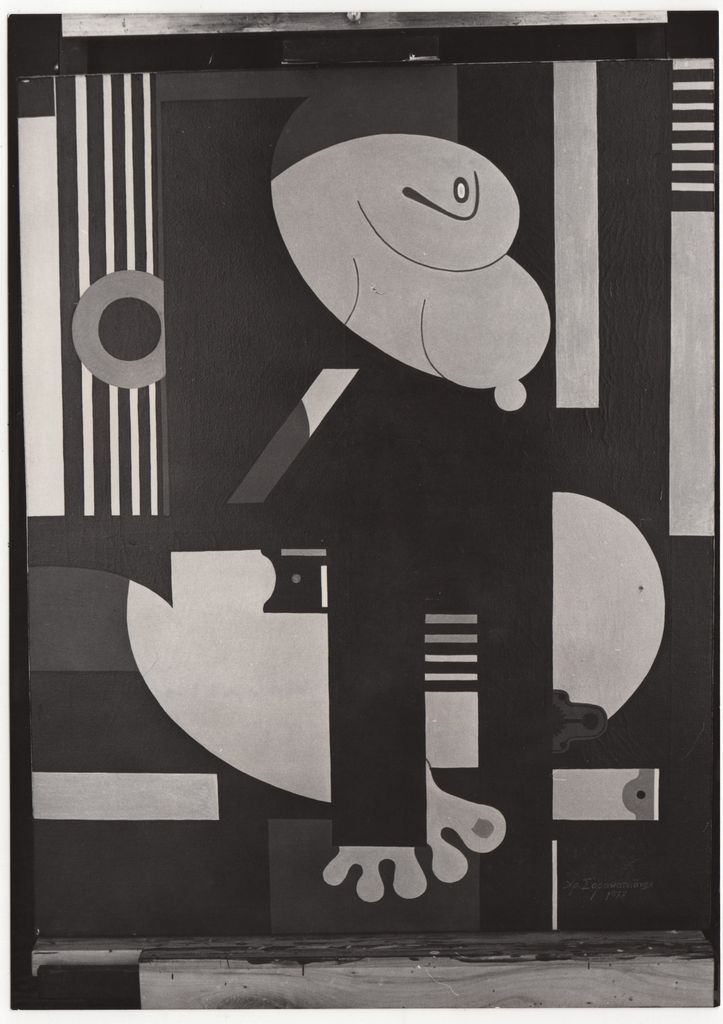 Φωτογραφία, α/μ, φωτογραφικό χαρτί, 18,2×13,0 εκ. Αναπαραγωγή έργου του Χρήστου Σαρακατσιάνου (ακρυλικό, 1977). Στην πίσω όψη, επιγραφή με τα στοιχεία του έργου.