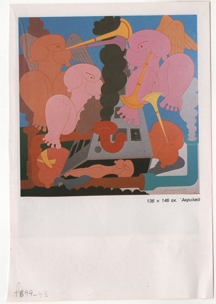 Έντυπο, στα ελληνικά, μονόφυλλο, δύο όψεις, χαρτί ιλουστρασιόν, 20,5×14,2 εκ. Αναπαραγωγή έργων του Χρήστου Σαρακατσιάνου.