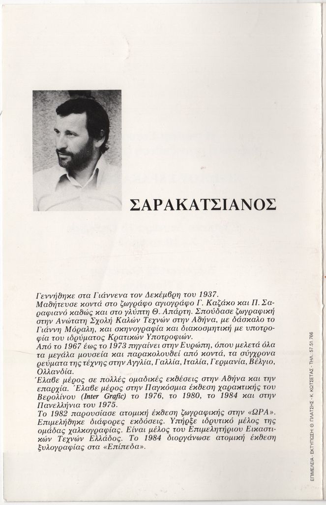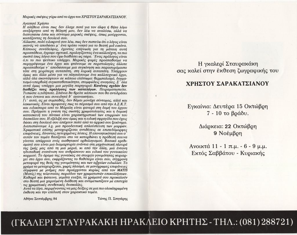 Έντυπο, στα ελληνικά, δίπτυχο, ιλουστρασιόν χαρτόνι, 20,5×13,0 εκ. Πρόσκληση των εγκαινίων της ατομικής έκθεσης ζωγραφικής του Χρήστου Σαρακατσιάνου στο Ηράκλειο Κρήτης το 1984. Περιέχει κείμενο του Τώνη Σπητέρη και βιογραφικό καλλιτέχνη. Στο εξώφυλλο, εικονογράφηση.
