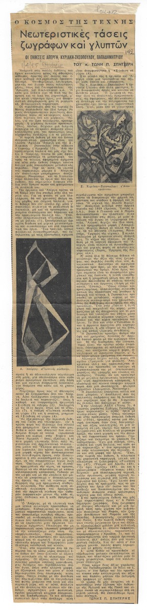 Απόκομμα της εφημερίδας “Ελευθερία” (01/04/1955) δημοσίευσης κριτικής του Τώνη Σπητέρη αναφερόμενη στις εκθέσεις των Αχιλλέα Απέργη, Κυριάκη-Ζησοπούλου Σαπφούς και Ευθύμη Παπαδημητρίου.