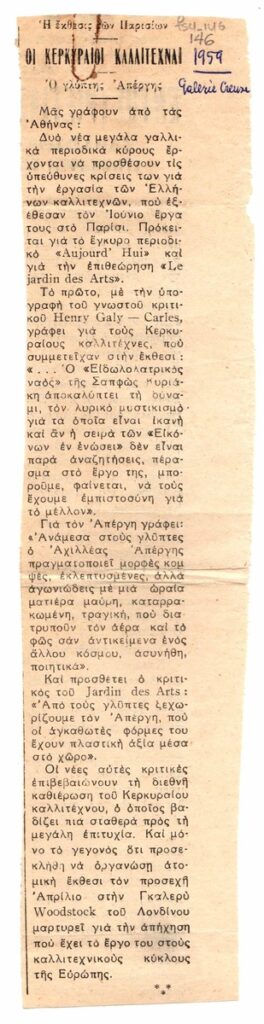 Απόκομμα εφημερίδας, δημοσίευσης άρθρου αναφερόμενου στον Αχιλλέα Απέργη και την Κυριάκη-Ζησοπούλου Σαπφώ με αφορμή ομαδική τους έκθεση στην Galerie Creuse. Γίνεται αναφορά σε ξένα δημοσιεύματα του Τύπου αναφορικά με τους καλλιτέχνες.