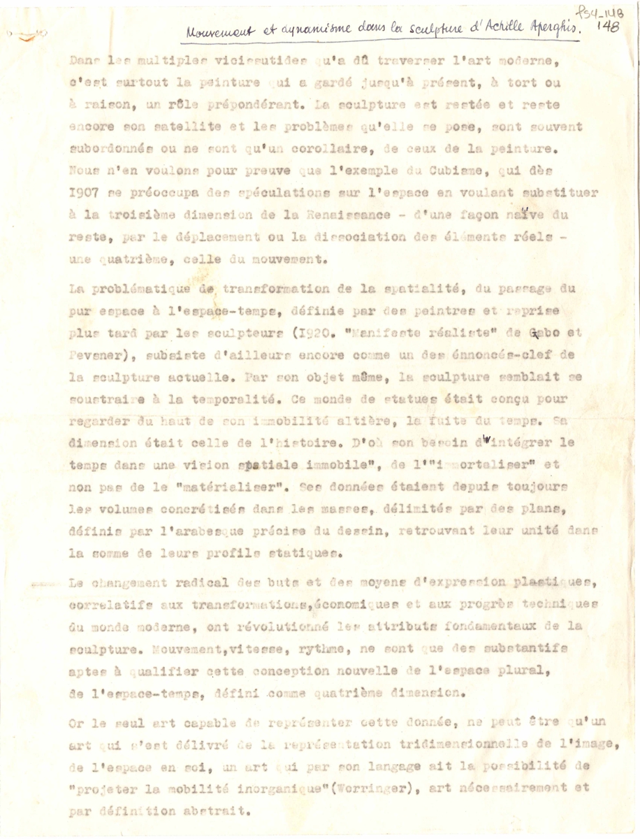 Κείμενο δακτυλόγραφο, χαρτί, 3 φφ, 28×21,5 εκ., στα γαλλικά για τον Αχιλλέα Απέργη. Αποτελεί προσχέδιο δημοσίευσης.