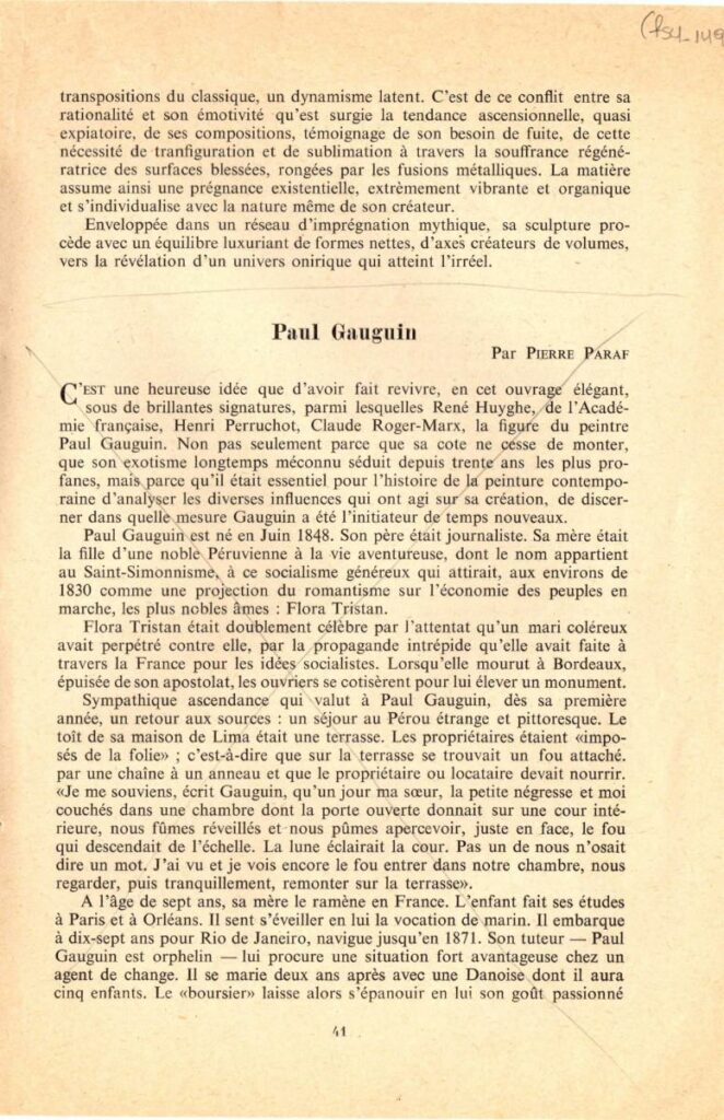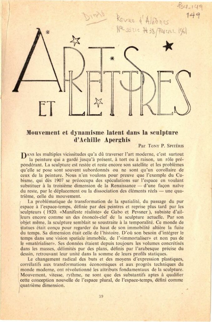 Απόκομμα του περιοδικού “Revue d’ Athènes”, τεύχος 02/1961, δημοσίευσης αναφερόμενης στον Αχιλλέα Απέργη και το έργο του.