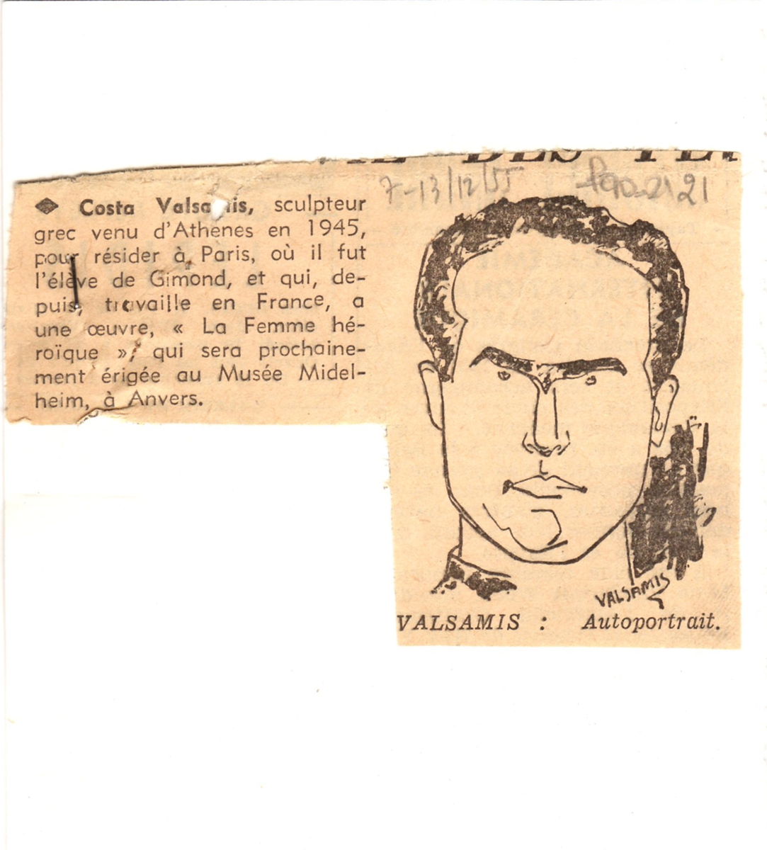 Απόκομμα, χαρτί, ακανόνιστου σχήματος συρραμμένο σε απόκομμα πρόσκλησης, στα γαλλικά, για τον Κώστα Βαλσάμη και το έργο του “La femme héroique” (Ηρωική γυναίκα) το οποίο πρόκειται να εκτεθεί στο Musée Midelheim στην Αμβέρσα.