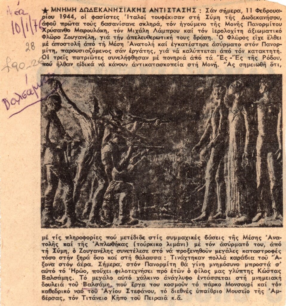 Απόκομμα, χαρτί, 12,5×11,5 εκ., στα ελληνικά, που περιλαμβάνει αναπαραγωγή έργου του Κώστα Βαλσάμη. Πρόκειται για χάλκινο ανάγλυφο αφιερωμένο στους πεσόντες για τη Σύμη το Φεβρουάριο του 1944.