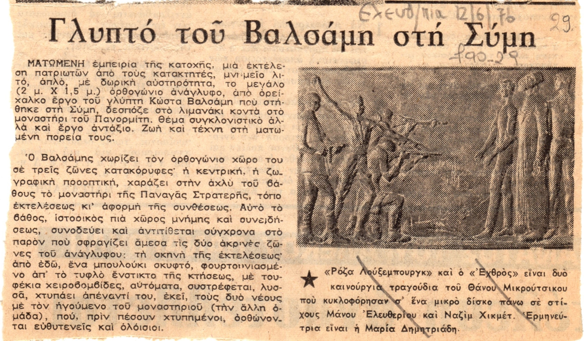 Απόκομμα, χαρτί, 9×14 εκ., στα ελληνικά, δημοσίευσης άρθρου για τον Κώστα Βαλσάμη και γλυπτό του που στήθηκε στη Σύμη στη μνήμη των πεσόντων υπερασπιστών του νησιού το 1944.