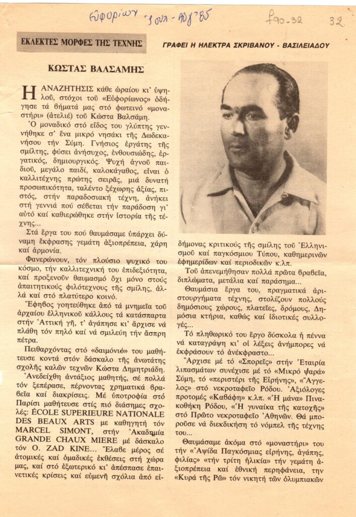 Απόκομμα , χαρτί, 24×17 εκ., στα ελληνικά, δημοσίευσης κειμένου αναφερόμενου στον Κώστα Βαλσάμη. Εντάσσεται στη στήλη του εντύπου “Εκλεκτές μορφές της τέχνης”. Το απόκομμα εικονογραφείται και φέρει επιγραφές.