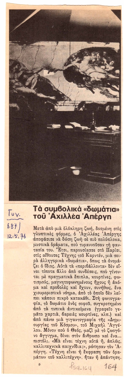 Απόκομμα, χαρτί, 26,5×9 εκ., στα ελληνικά, δημοσίευσης κριτικής έκθεσης του Αχιλλέα Απέργη, η οποία διεξάγεται στο Espace Cardin στο Παρίσι.