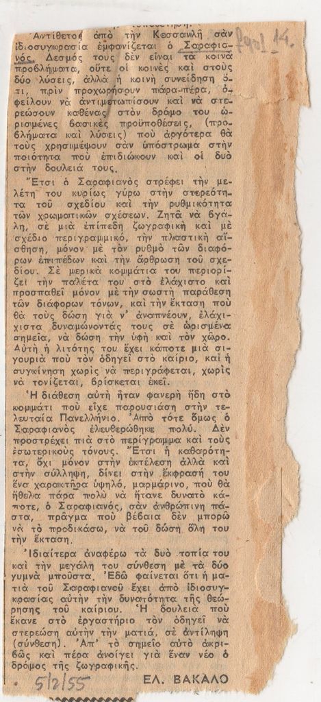 Απόκομμα, χαρτί, 14×6 εκ., στα ελληνικά, δημοσίευσης κριτικής για το έργο του Πάνου Σαραφιανού, που παρουσιάζει σε ομαδική έκθεση με τον Νίκο Κεσσανλή, στην γκαλερί Άδελ, στην Αθήνα.
