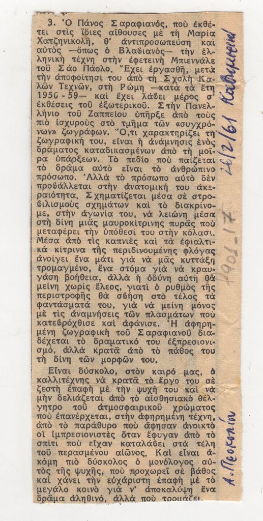Απόκομμα, χαρτί, 13×5,5 εκ., στα ελληνικά, δημοσίευσης κριτικής έκθεσης των Μαρίας και Πάνου Σαραφιανού στην Αθήνα.
