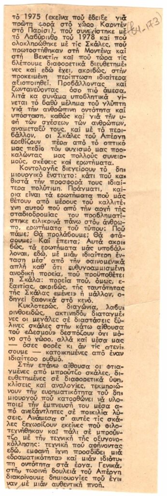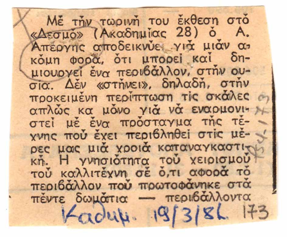 Απόκομμα, χαρτί, 2 φφ, 4,5×5,5 και 19,5×5 εκ., στα ελληνικά, δημοσίευσης άρθρου για τον Αχιλλέα Απέργη και το έργο του με αφορμή έκθεσή του στην Αίθουσα Τέχνης Δεσμός στην Αθήνα.