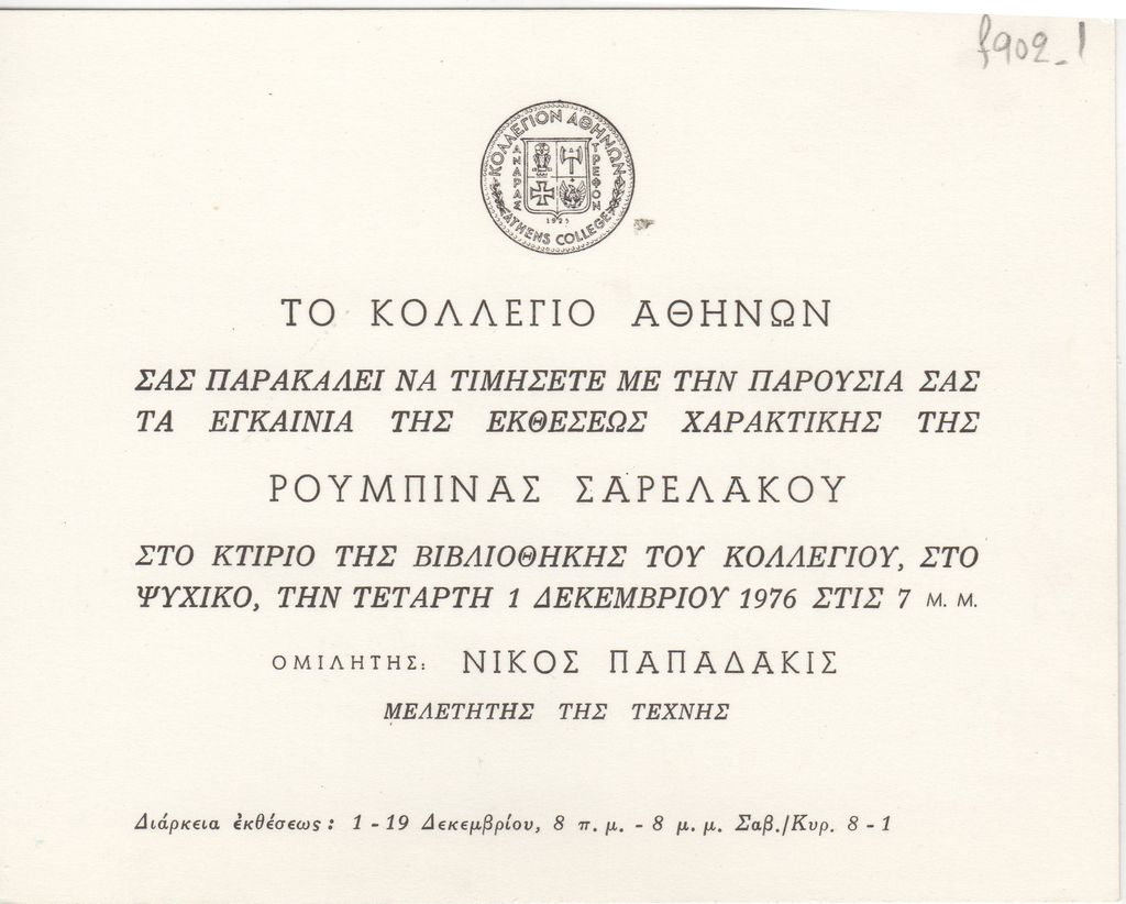 Πρόσκληση, χαρτόνι, 11,5×14,5 εκ., στα ελληνικά, εγκαινίων έκθεσης της Ρουμπίνας Σαρελάκου.