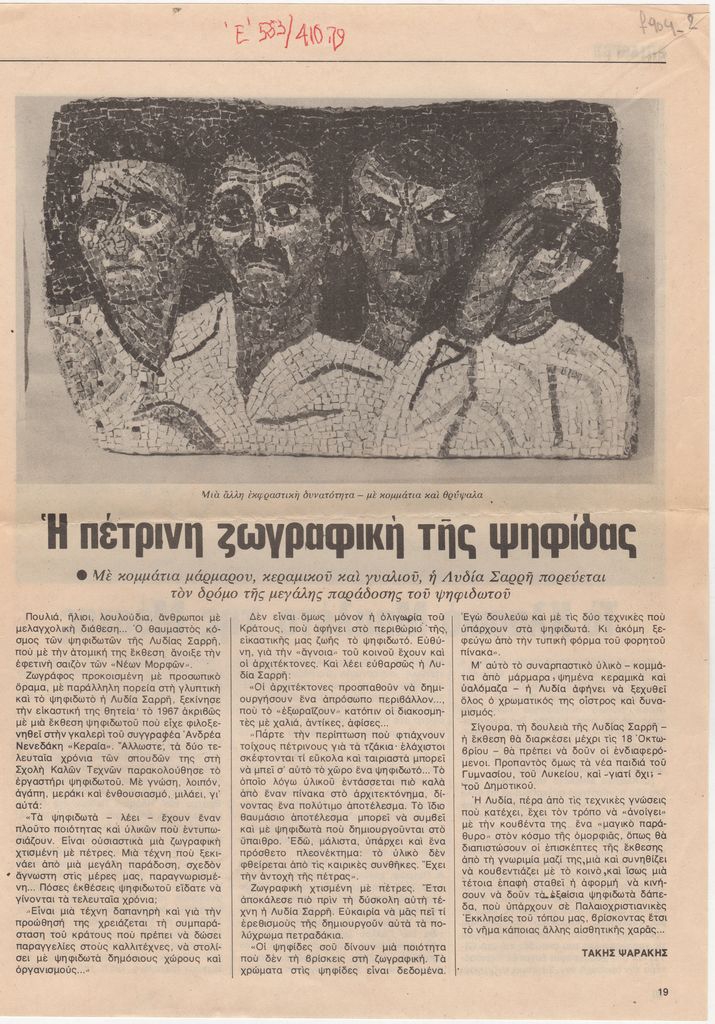 Απόκομμα, χαρτί, 29.5×21 εκ., στα ελληνικά, δημοσίευσης κριτικής έκθεσης της Λυδίας Σαρρή.