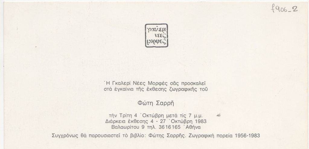 Πρόσκληση, χαρτόνι, 10×20 εκ., στα ελληνικά, εγκαινίων έκθεσης ζωγραφικής του Φώτη Σαρρή.
