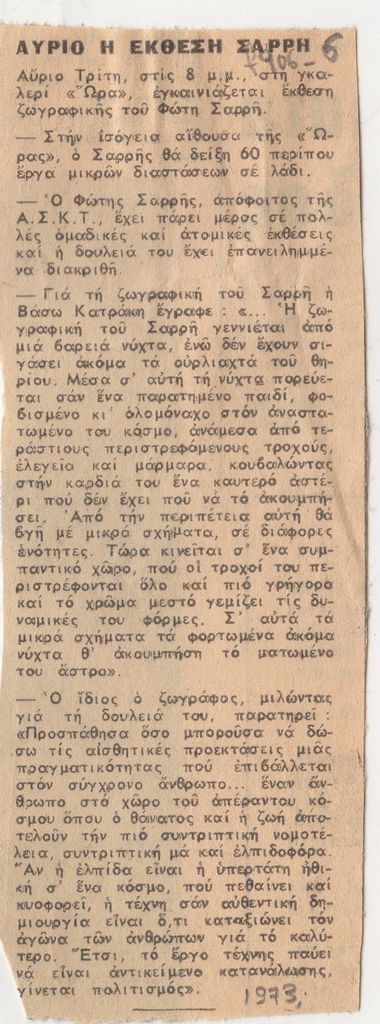 Απόκομμα, χαρτί, 13×5 εκ., στα ελληνικά, δημοσίευσης αναγγελίας εγκαινίων έκθεσης του Φώτη Σαρρή, στο Καλλιτεχνικό Πνευματικό Κέντρο Ώρα στην Αθήνα. Σχολιάζεται το εικαστικό του έργο.