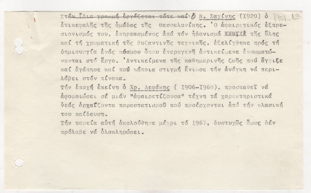 Κείμενο, δακτυλόγραφο, χαρτί, 13×21.5 εκ., στα ελληνικά, για τον Νίκο Σαχίνη. Ασκείται κριτική στο εικαστικό του έργο.